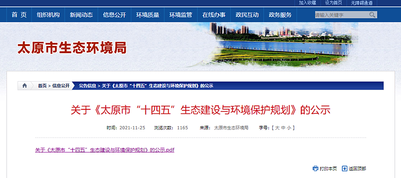 近日,太原市生態(tài)環(huán)境局在其官網(wǎng)發(fā)布了關(guān)于《太原市“十四五”生態(tài)建設(shè)與環(huán)境保護(hù)規(guī)劃》(下文簡(jiǎn)稱(chēng)《規(guī)劃》)的公示。