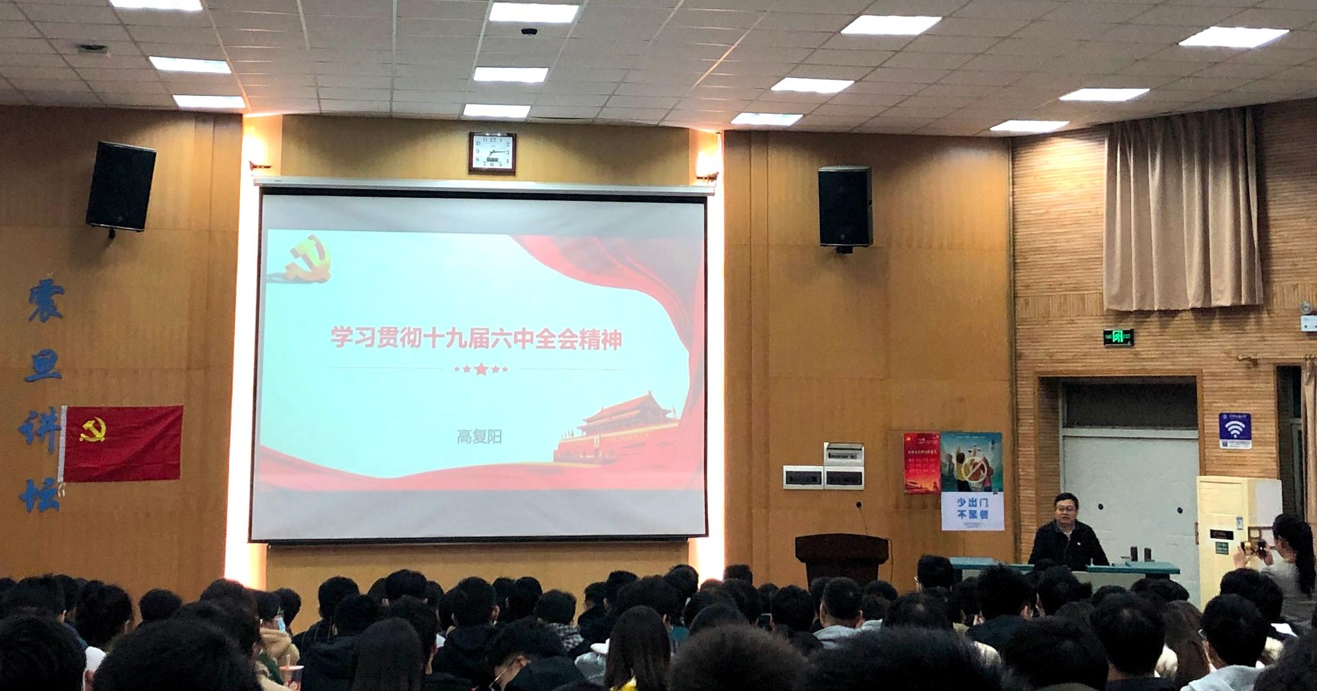 隨后,高復陽作黨的十九屆六中全會精神輔導報告。他介紹了黨的十九屆六中全會的歷史背景、重大意義、會議概況和主要成果,領學了《中共中央關于黨的百年奮斗重大成就和歷史經驗的決議》,分享了學習貫徹黨的十九屆六中全會精神的學習體會。他講到,黨的十九屆六中全會是在中國共產黨成立一百周年的重要歷史時刻,開啟全面建設社會主義現代化國家新征程之際,召開的一次具有里程碑意義的重要會議。