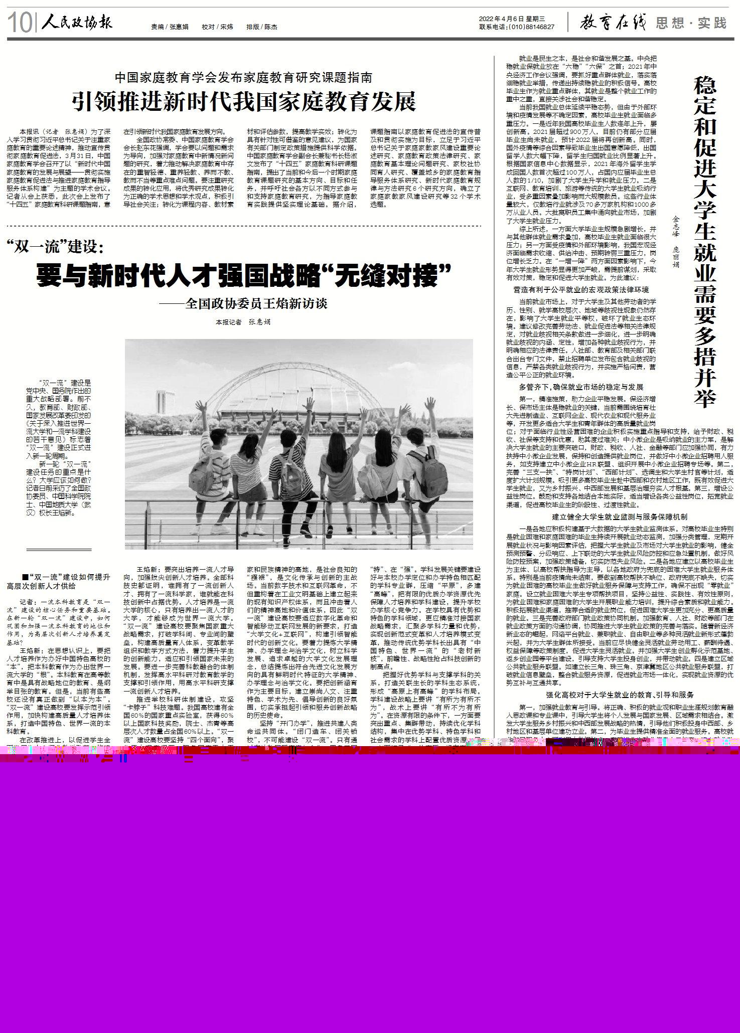 王焰新:要突出培養(yǎng)一流人才導(dǎo)向,加強(qiáng)拔尖創(chuàng)新人才培養(yǎng)。全部科技史都證明,誰(shuí)擁有了一流創(chuàng)新人才、擁有了一流科學(xué)家,誰(shuí)就能在科技創(chuàng)新中占據(jù)優(yōu)勢(shì)。人才培養(yǎng)是一流大學(xué)的核心,只有培養(yǎng)出一流人才的大學(xué),才能夠成為世界一流大學(xué)。“雙一流”建設(shè)高校要聚焦國(guó)家重大戰(zhàn)略需求,打破學(xué)科間、專業(yè)間的壁壘,構(gòu)建高質(zhì)量育人體系,變革教學(xué)組織和教學(xué)方式方法,著力提升學(xué)生的創(chuàng)新能力,適應(yīng)和引領(lǐng)國(guó)家未來(lái)的發(fā)展。要進(jìn)一步完善科教融合的體制機(jī)制,發(fā)揮高水平科研對(duì)教育教學(xué)的支撐和引領(lǐng)作用,用高水平科研支撐一流創(chuàng)新人才培養(yǎng)。