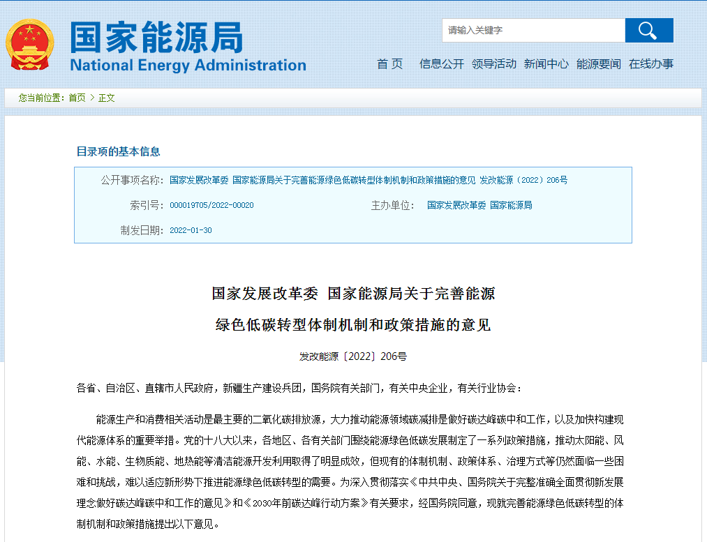 國家發展改革委、國家能源局近日公布《關于完善能源綠色低碳轉型體制機制和政策措施的意見》(以下簡稱《意見》),明確到2030年,基本建立完整的能源綠色低碳發展基本制度和政策體系,形成非化石能源既基本滿足能源需求增量又規?;娲?a href="http://www.mayacollection.com.cn/t/化石能源.html" >化石能源存量、能源安全保障能力得到全面增強的能源生產消費格局。