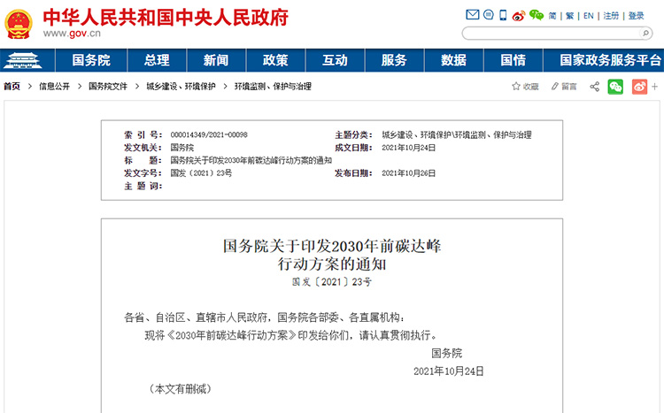 國務院關于印發2030年前碳達峰