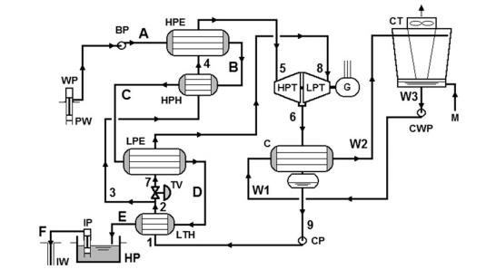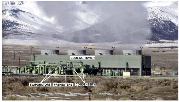 最新的USGeo拉夫特河發電站坐落在起初的電站南南東方向約600m的地方。這個最新的發電機組的能量對流系統是一個部分回熱,二級,雙壓力雙循環發電機組。有兩個單獨的單元,每一個單元都有兩個軸向流動的渦輪來驅動同一個中心發電機。一個四室的水冷卻塔為殼管冷凝器(shell-and-tube condensers)提供冷卻提供冷卻水。補充水是從水井中獲取的,而且需要及時處理來維持冷卻塔中的水的質量。138℃的鹵水以大約3.15×106kg/s的速度泵向蒸發器和預熱器,循環工質異戊烷(i-C5H12)就是在蒸發器和預熱器中吸收溫度的。換熱器只在高壓循環中才使用。