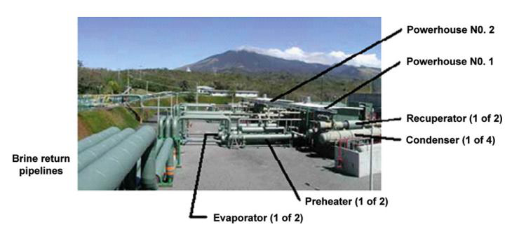 哥斯達黎加的米拉瓦列斯地熱電站是以火山作為熱源的地熱電站。米拉瓦列斯地熱田處于更新世(Pleistocene)火山口。在米拉瓦列斯火山,是一個發育在火山口邊緣上的后火山口。這個地區的巖性特包括一系列的火山巖和火山碎屑帶。高溫地熱流體產生于斷裂構造中,熱儲層主要是地層中的晶巖系凝灰巖、安山質熔巖、流紋巖狀凝灰巖。在米拉瓦列斯地熱田鉆的深水井有,PGM1,2,3,5,10,11,12和15,這些深井可以用來分析獲取地熱田的溫度分布狀態。在地熱田的西邊有冷水入侵,所以向西地熱溫度急劇降低,向南也是逐漸降低,但是速度相對緩慢。在海拔-200m的地方,地熱溫度達到了最高值,高于240℃。